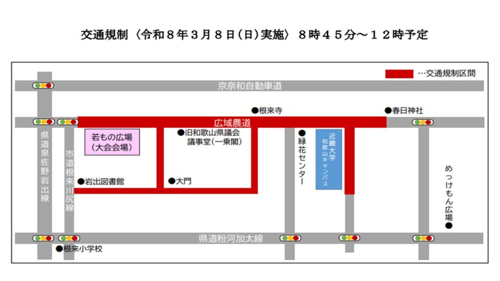 令和8年3月8日(日)実施の「第20回岩出マラソン大会」につきまして、大会当日、下記のとおり交通規制を行います。 つきましては、下記の道路をご利用される方及びコース周辺の方々には大変ご迷惑をお掛けしますが、ご協力下さいますようお願いいたします。 なお、コース周辺の皆様方におかれましては、参加選手に対する温かいご声援も併せてよろしくお願いいたします。 〔※交通規制につきましては、競技進行の状況により若干変更する場合があります。〕